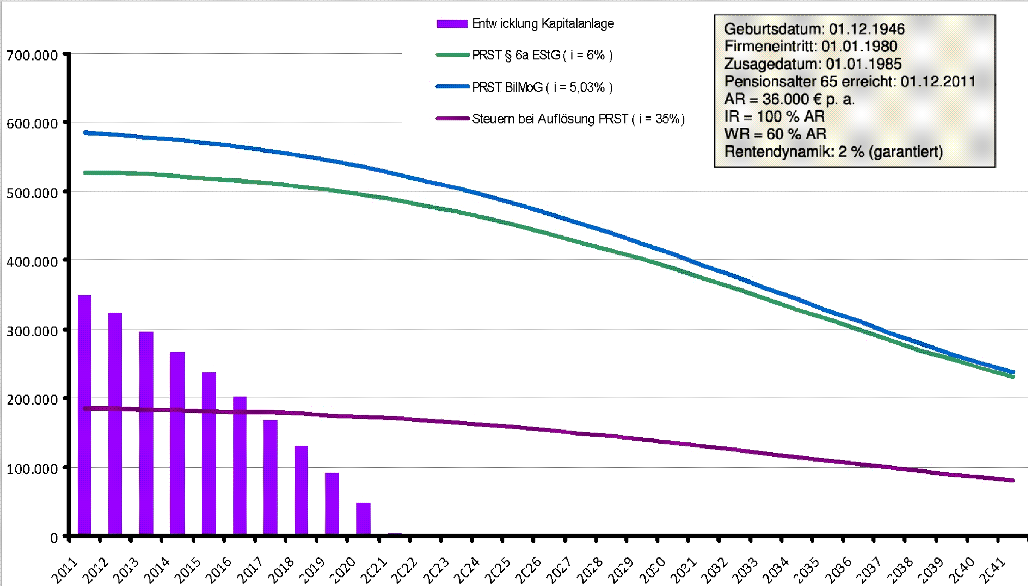 • Die zu bildenden Pensionsrückstellungen (PRSt) nach § 6a EStG mit einer angenommenen